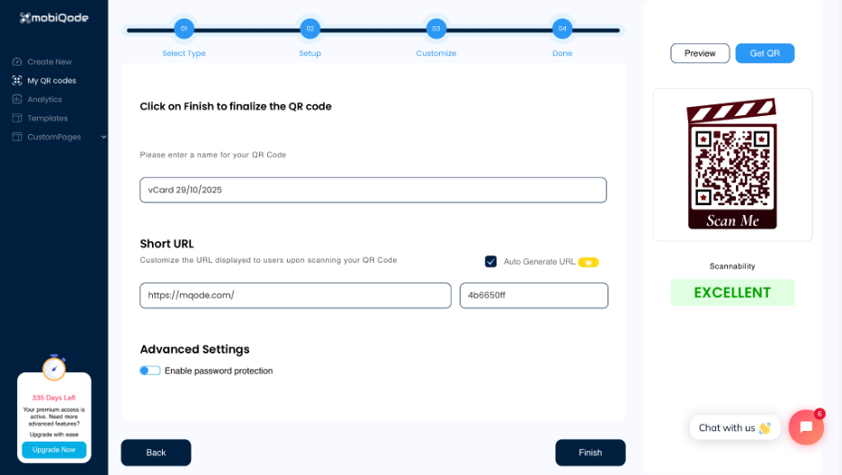 You can also completely change the design of your digital business card with mobiQode. Use your brand colors, upload your logo, and add a short call to action like ‘Schedule a call’ or ‘Visit my portfolio.’