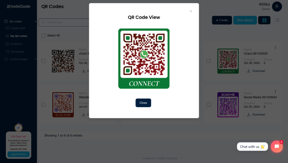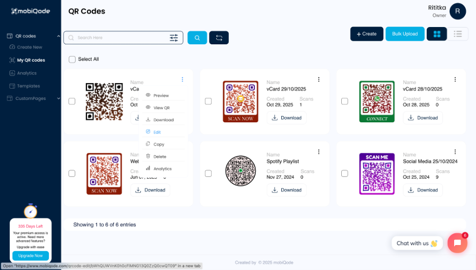 mobiQode gives you 5 free dynamic QR codes, with editable info anytime. Paid plans start at just $3/month and scale up to 1,000 QR codes and 1,00 custom pages.