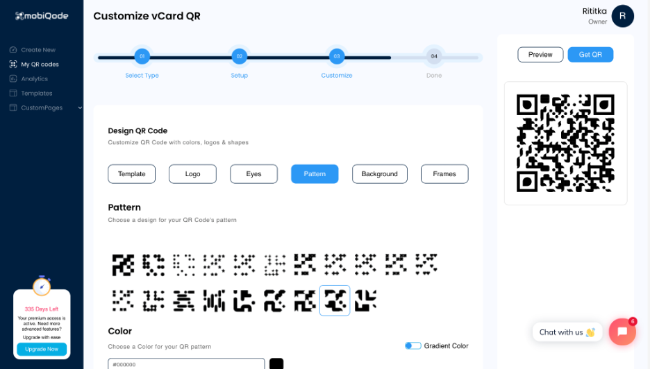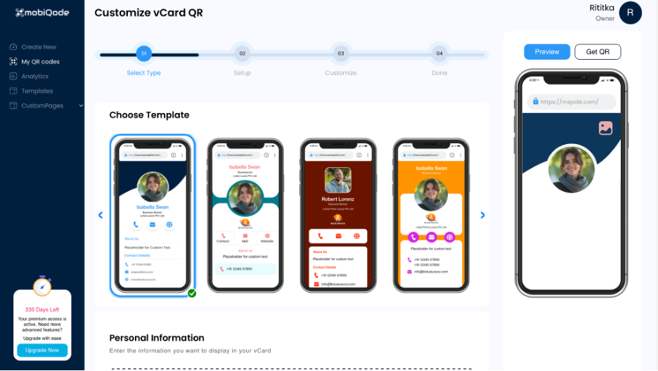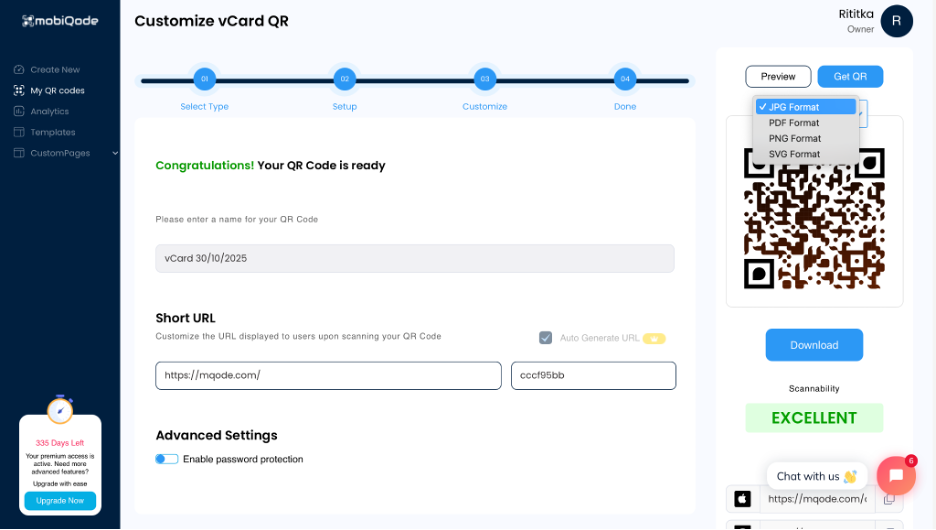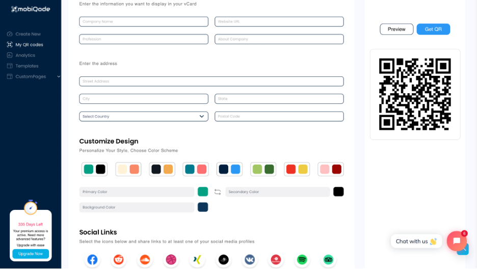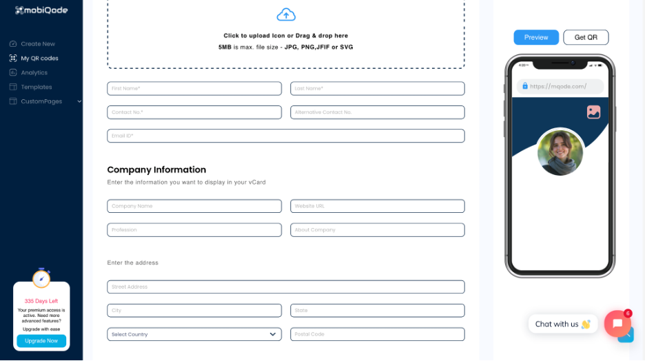 5. Generate your QR code: mobiQode automatically gives you a dynamic QR code once you add all the info needed for the digital business card. This can be edited anytime without reprinting or redistribution.