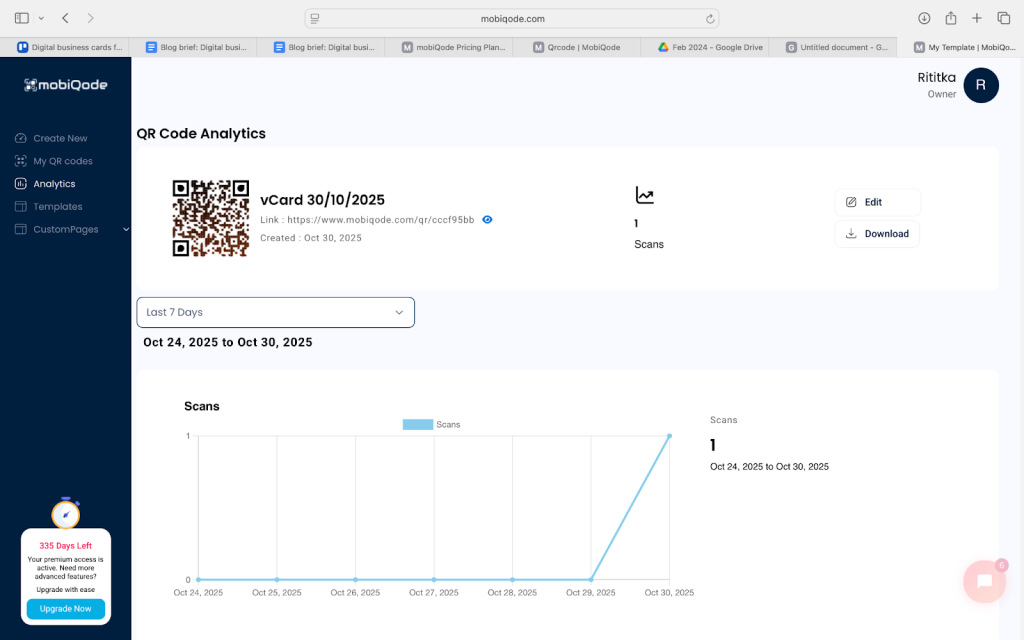 With mobiQode, you also get one of the best digital business cards with a custom landing page, which is customizable and connected to dynamic QR codes, so your card is always up to date and trackable in real-time.