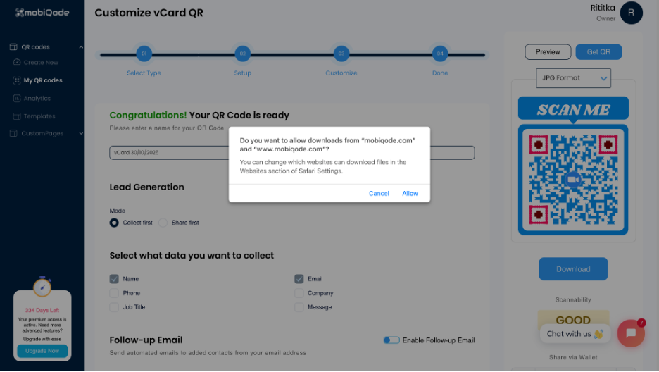 You can create digital business cards on mobiQode with dynamic QR codes. This means your updates stay live, your printed materials remain usable, and your networking stays uninterrupted even when you update the information in your cards.