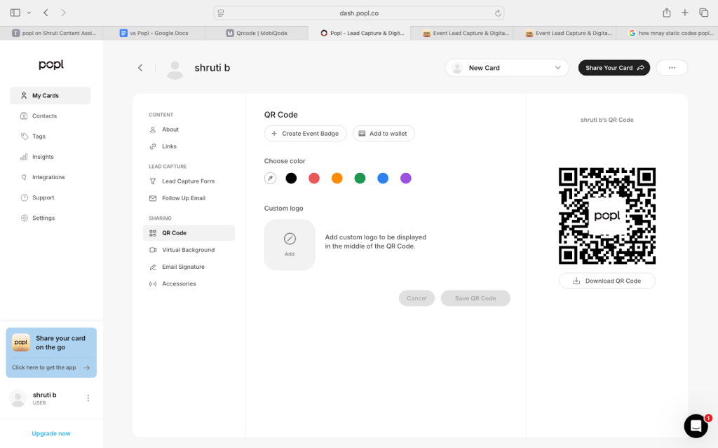 With Popl, you can add basic details such as your name, pronouns, photo, and bio. It also lets you adjust colors, but there are no templates or layouts available for the digital business card itself. For QR codes, customization is minimal as well, as you can only change the color. There’s no option to modify the text or add design elements, and the free plan includes Popl’s branding watermark on the QR code.