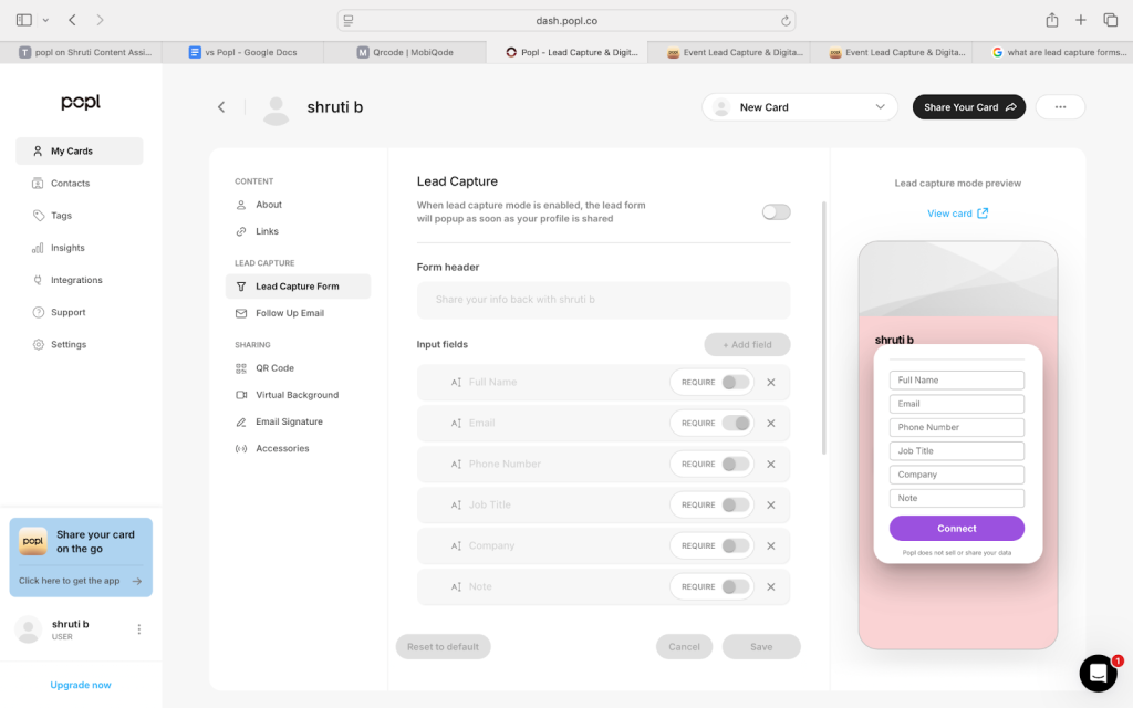 Popl offers lead capture forms that help you collect contact information from users interested in your business. You can add various fields to gather whatever information is relevant, and the form pops up when the QR is scanned.