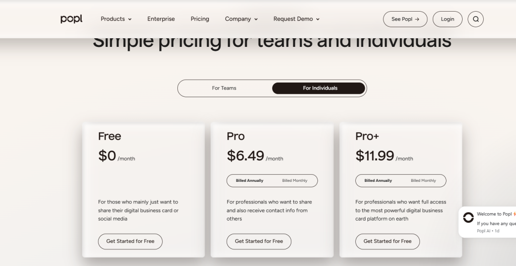 Popl’s pricing starts at $6.49/month but includes only 2 digital business cards, with no clear mention of bulk creation and template options like in mobiQode.