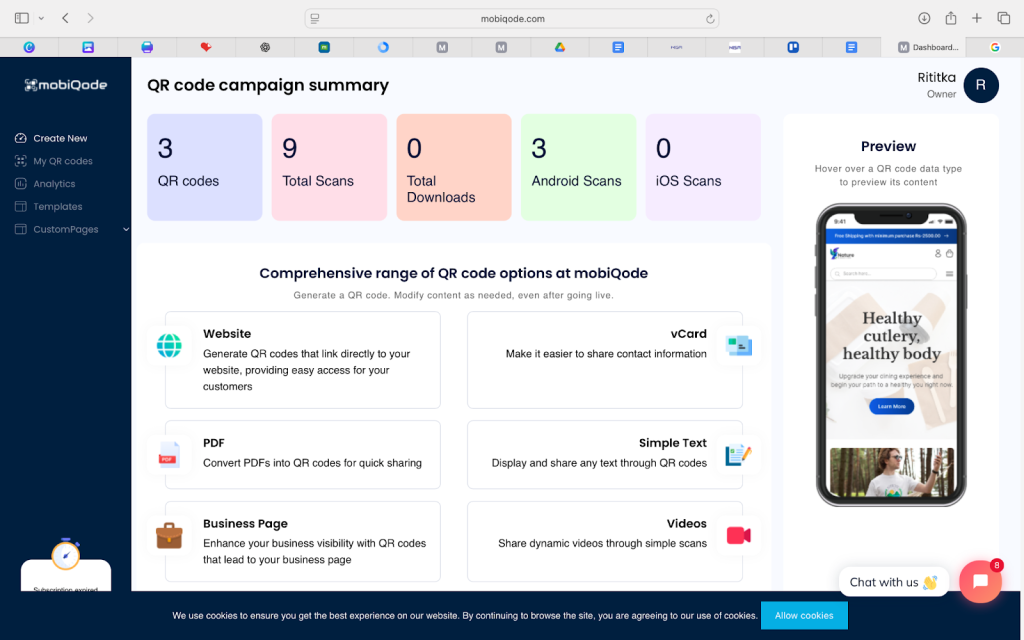 Mobiqode, on the other hand, keeps things clean and simple, so you can get your QR codes done fast and without any headaches. All codes can be created in under two minutes in a few simple steps. The dashboard is simple, reusable templates save time, and there are no ad interruptions or unnecessary complexity.