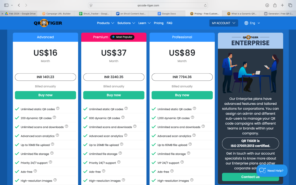 QR Code Tiger gets flak for unclear pricing. A lot of features are locked behind higher plans, there are no loyalty perks, and some users have to keep paying just to stop their codes from expiring. Premium plans start at $16/month, which can feel pricey for what you actually get.