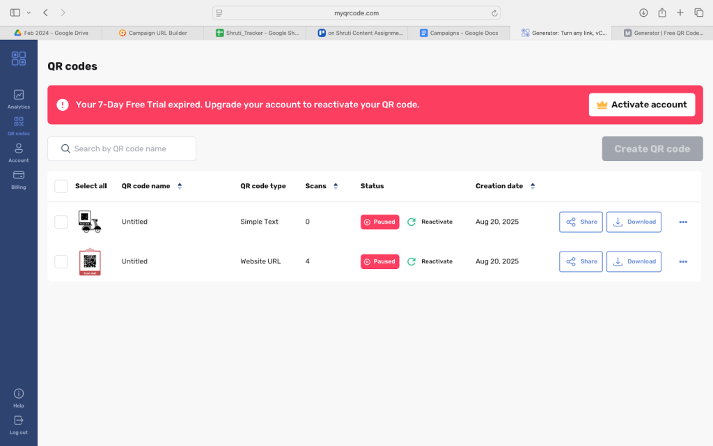If you go for a paid plan, you get dynamic QR codes, basic scan analytics, and some customization starting at $20/month. But even then, ads stick around, and features like advanced analytics or bulk generation aren’t as strong as other platforms.