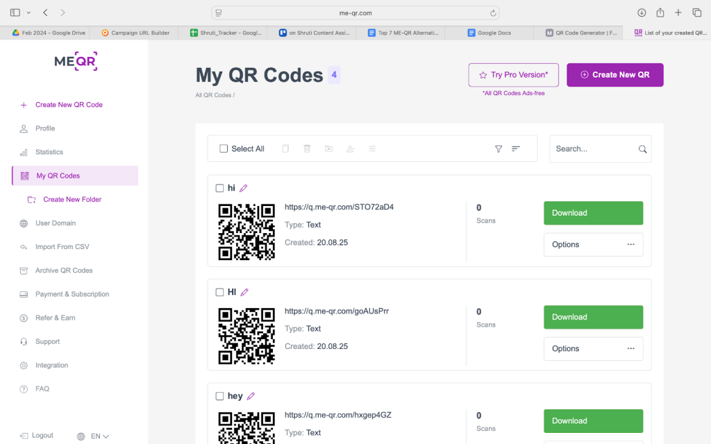 ME-QR offers dynamic QR codes, basic customization, and analytics such as scan counts. Bulk generation is available, though not very seamless, and analytics are mostly limited to scan counts.