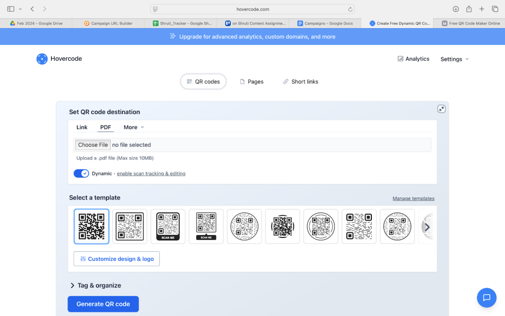 Hovercode brands itself as a clean, ad-free QR code solution with integrations like Google Analytics. You get basic scan stats for all dynamic codes, but people have mentioned it’s pretty limited when it comes to customization.
